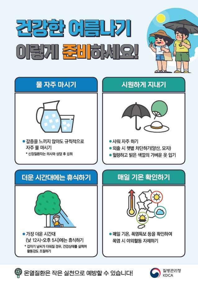온열질환 예방을 위해서는 폭염에 취약한 고령자와 독거노인, 어린이, 야외근로자 및 만성질환자는 집중 건강관리가 요구되고, 물 자주 마시기, 더운 시간대에는 휴식하기, 야외활동 자제하기 등 건강수칙을 준수하는 것이 매우 중요하다.