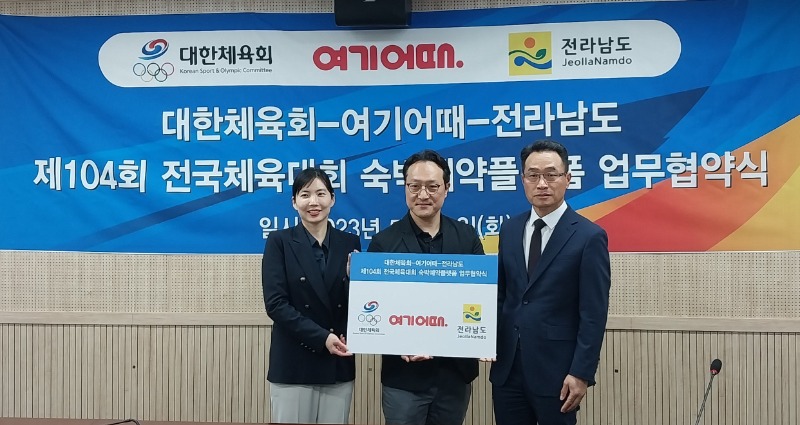 전라남도와 대한체육회는 23일 도청에서 오는 10월 제104회 전국체전 참가를 위해 방문하는 선수단과 관람객의 숙박 편의 증진을 위해 여행 플랫폼인 ‘여기어때’와 업무협약을 했다.