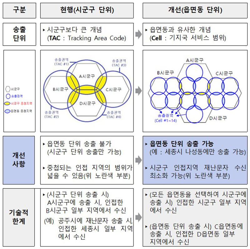 이에 행안부와 이동통신 3사에서는 각각의 재난문자시스템 기능을 읍·면·동 단위로 전면 개편했고, 지난해 5월부터 올해 4월까지 지자체, 한국전자통신연구원과 합동으로 실증시험 및 시험운영을 마쳤다.