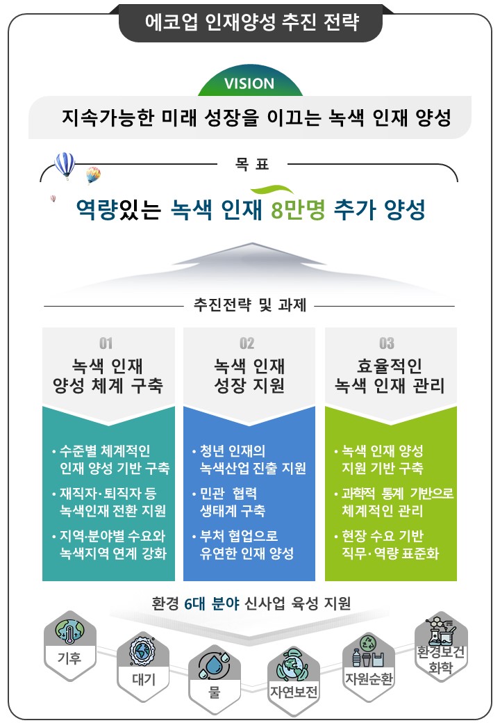 정부는 경제성장의 핵심가치이자 미래 먹거리인 에코업에 대한 기업의 생산성과 경쟁력을 증대하기 위해 오는 2027년까지 녹색인재 8만 명 추가 양성을 목표로 에코업 인재 양성방안을 수립해 추진한다.
