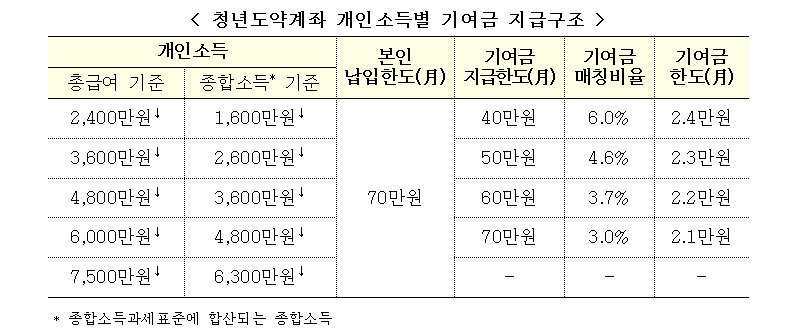 개인소득의 경우 상한선이 7500만원이다. 직전 과세기간(2022년도)의 총급여가 6000만원 이하의 경우 정부기여금을 받고 비과세를 적용받을 수 있다. 총급여가 6000만을 초과하고 7500만원 이하인 경우 정부기여금은 지급되지 않지만, 비과세를 적용받는다.