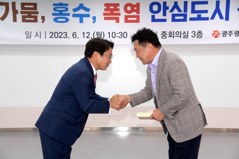강 시장은 이날 시청 중회의실에서 ‘가뭄·홍수·폭염 안심도시 광주 추진계획’을 발표하고, 물 절약 실천 우수시민 12개 단체에 감사패를 수여했다. 또 가뭄극복 성과평가에서 최우수 자치구에 광주시 서구를 선정하고 특별교부금(13억원)을 지급했다.