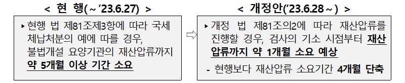 이에 검사의 기소부터 재산압류까지 소요되는 기간이 약 1개월로 단축되어 현재보다 4개월 이상 신속하게 불법개설 요양기관의 부당이득 징수금에 대한 징수 재원을 확보할 수 있게 되었다.