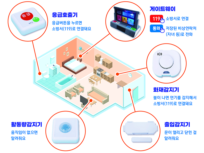 이에 정보통신기술 기반의 장비를 집안에 설치해 화재 등 응급상황 및 활동이 감지되지 않는 상황에 119로 자동 신고하는 등 구급·구조를 지원하고 있다.