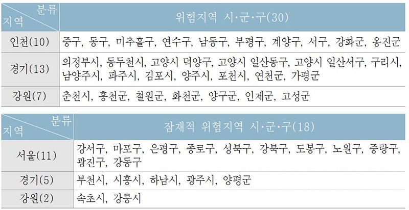 지역별로는 경기(67.2%), 인천(10.9%), 서울(10.2%), 강원(5.1%) 순으로 환자가 많이 발생했는데, 역학조사 결과 말라리아 추정감염지역은 경기 파주시, 김포시, 연천군, 인천 강화군, 강원 철원군 순으로 나타났다.