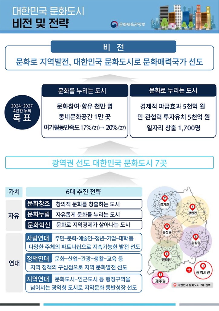 문체부는 지역 고유의 문화자원을 활용해 특색 있는 도시브랜드를 창출하고 도시의 경제적 발전과 지역 주민의 문화향유 확대를 선도하는 대한민국 대표 문화도시 7곳을 지정, 2024년부터 2027년까지 4년 동안 집중 육성해 문화균형발전을 선도할 계획이다.