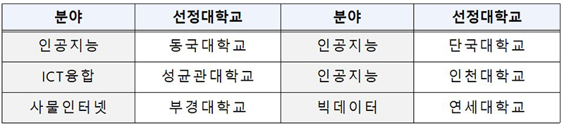 이에 올해 인공지능과 사물인터넷 등 분야 동국대, 성균관대 등 6개 대학을 선정했는데, 이 대학은 최장 5년(3+2년) 동안 연 2억 5000만 원 수준의 지원을 받아 대학당 연 10명을 양성한다.