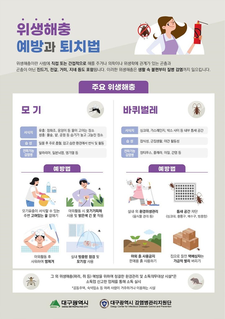 정의관 대구광역시 보건복지국장은 “여름철은 기온상승, 집중호우 등으로 위생해충과 감염병 발생이 증가하는 시기이므로 9개 구‧군과 협력하여 더욱 방역에 철저를 기하겠다”며, “시민들도 감염병 예방수칙을 준수하여 모두 함께 건강한 여름을 보낼 수 있기를 바란다”고 당부했다.