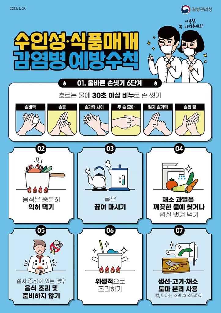 고온다습한 여름 장마철은 해충들의 번식과 활동이 증가하는 시기로 말라리아, 일본뇌염 등과 같은 모기매개 감염병이 유행할 수 있으며, 침수 등으로 위생이 취약한 환경에서는 오염된 물이나 식품으로 전파되는 수인성·식품매개 감염병에 대한 주의도 필요하다.