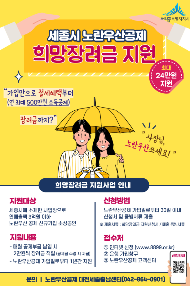 세종특별자치시가 소상공인의 노후와 안정적인 생활을 지원하기 위해 노란우산공제 희망장려금을 올 하반기에도 지속 지원한다.