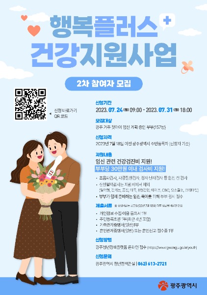 광주광역시(시장 강기정)는 첫 아이 임신을 준비하는 예비부모를 대상으로 임신 관련 건강검진비를 지원하는 ‘행복플러스 건강지원사업’ 하반기 대상자를 24일부터 31일까지 모집한다.