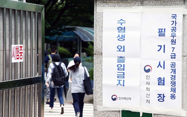 국가공무원 5급 공채 및 외교관 후보자 선발 제1차 시험이 치러진 지난 3월 서울 강남구의 한 시험장으로 수험생들이 들어가고 있다.(사진=인사처)