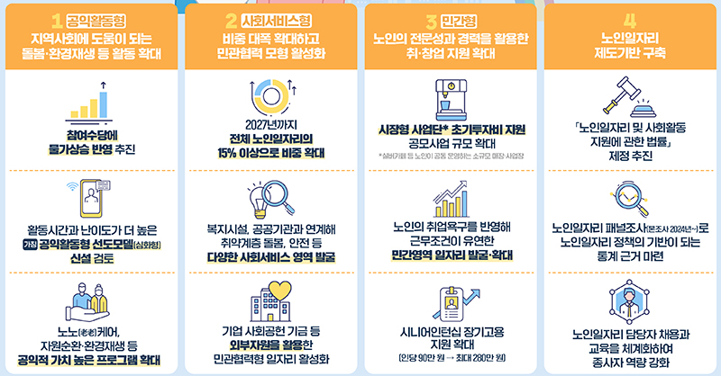 먼저 민간기업과 구직노인에 대한 지원을 다각화하고, 노인이 희망하는 근무 형태의 새로운 일자리도 지속 발굴한다.