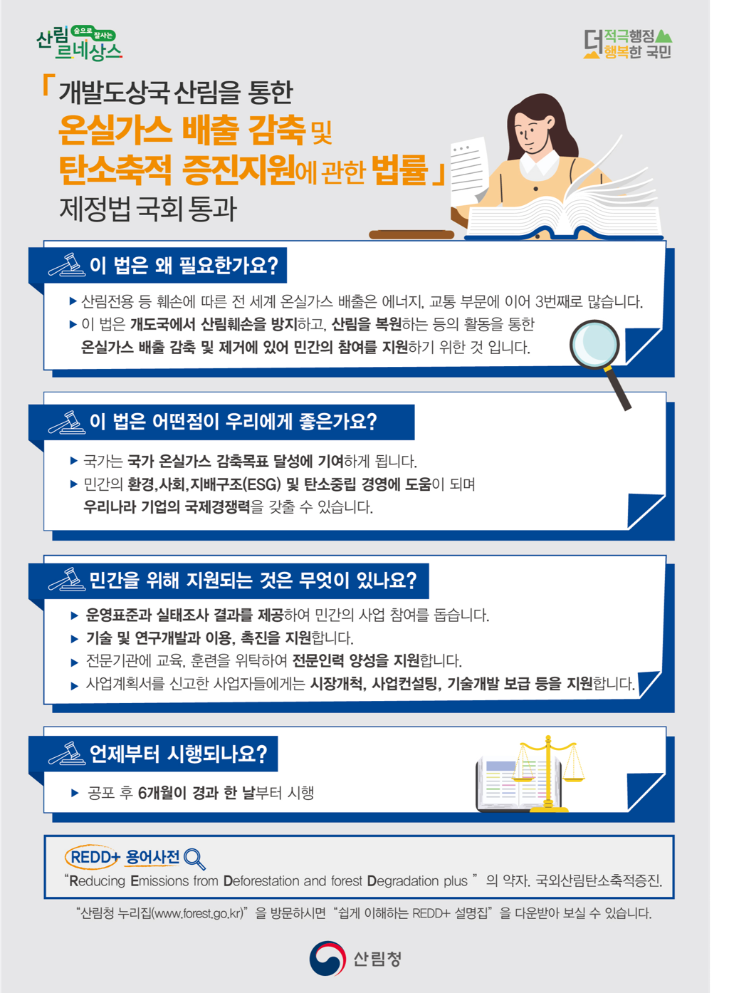 국외산림탄소배출감축사업(REDD+)은 기업들의 환경·사회·투명(ESG) 경영 및 탄소상쇄 달성에도 활용될 수 있는 만큼, 종합계획 수립, 한국형 운영표준 마련, 실태조사, 민간 역량 강화 및 전문인력 양성 등 사업 기반 조성 등의 내용이 포함된 법률이 시행됨으로써 민관이 함께 기후위기에 대응할 수 있을 것으로 기대된다.