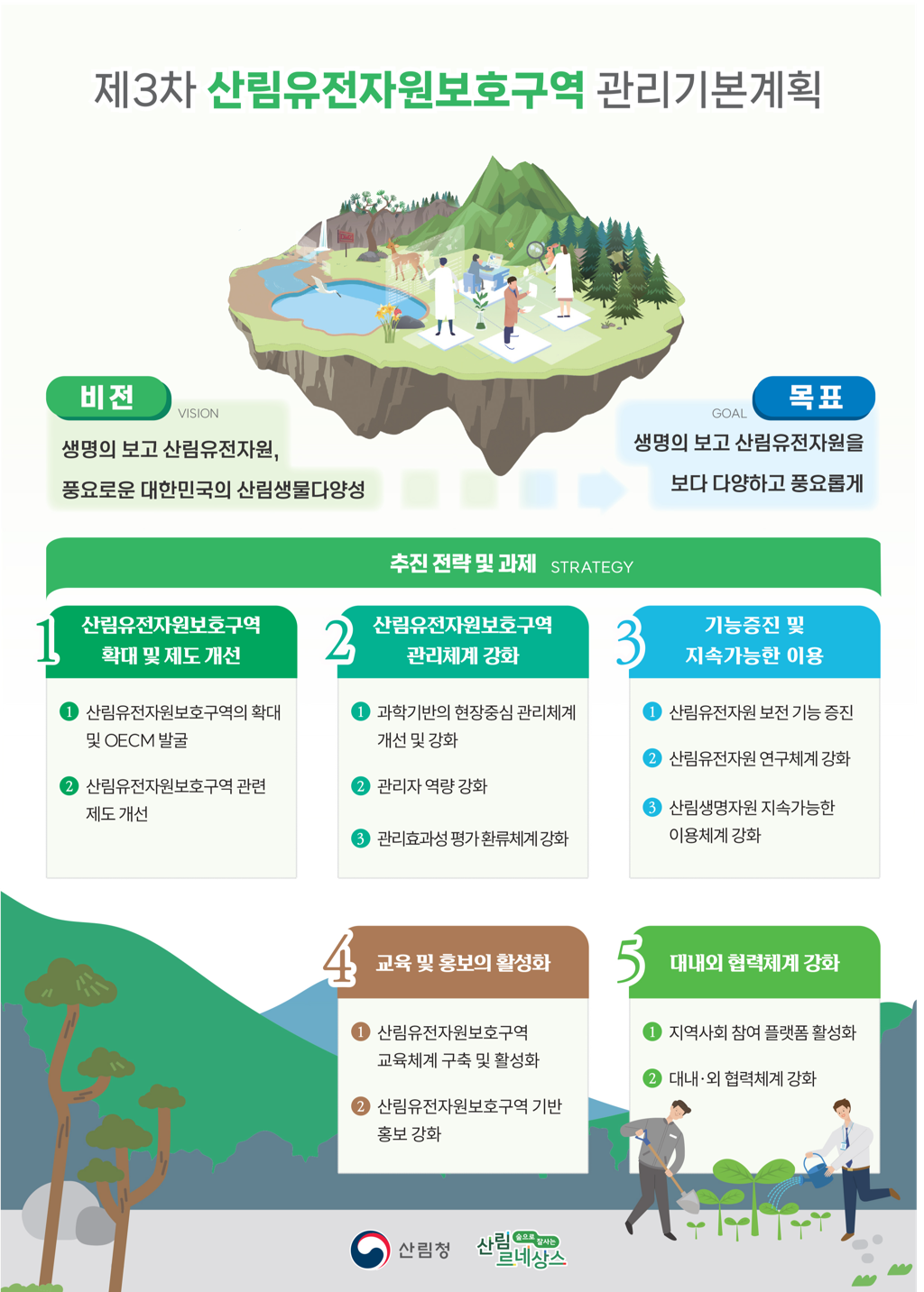 우선, 산림청은 2027년까지 국유림 지정과 더불어 공익임지를 사들여 5만ha의 산림유전자원보호구역을 확대할 계획이다. 또한, 기후변화에 따른 고산침엽수 쇠퇴 등 외부 환경변화에 따른 산림생태계 변화에 대한 모니터링도 강화한다. 유용식물을 활용한 산림 바이오 소재, 생명자원 개발 등 연구개발을 활성화하고, 이를 지역사회와 연계하여 산업화하는 방안도 적극 추진한다.