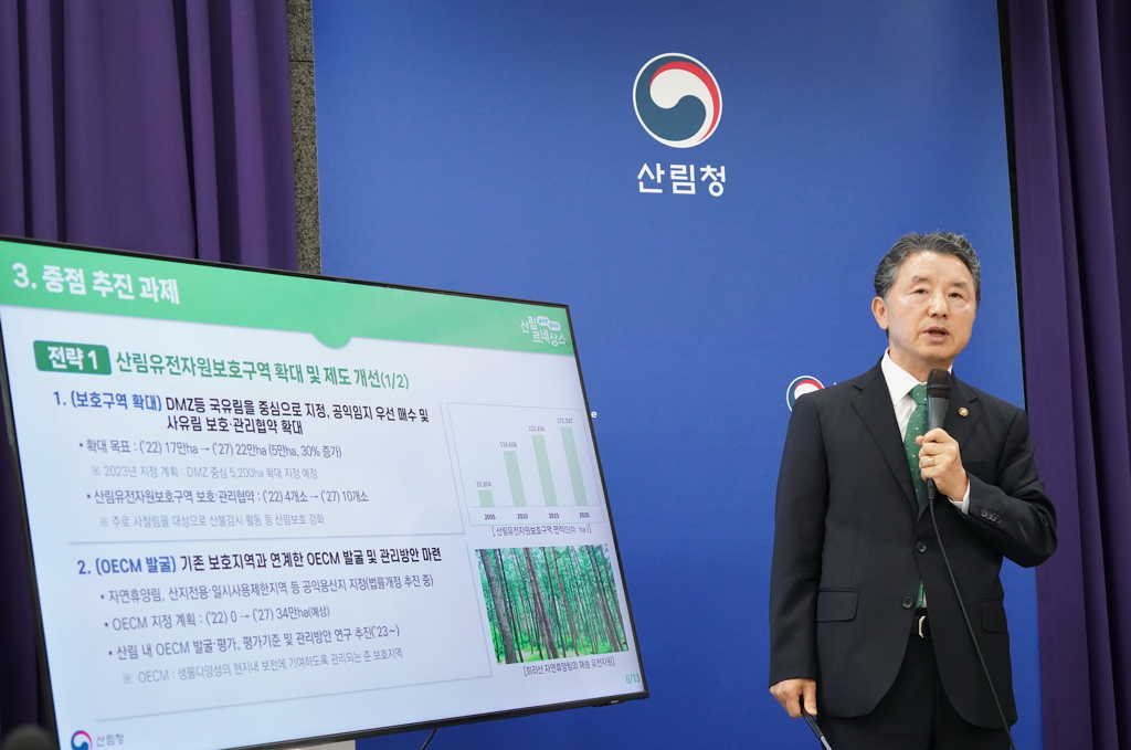 산림유전자원보호구역은 산림생물다양성 보존을 위한 핵심공간으로 현재 17만ha가 지정되어 있으나, 기후변화에 따른 희귀·특산·유용식물의 유지·보전을 위해서는 이를 확대 지정하는 것이 시급하다고 판단했기 때문이다. 한편, 지난해 12월 캐나다에서 열린 생물다양성협약* 제15차 당사국총회에서는 육상·해양 면적의 최소 30%를 보호지역으로 지정·관리하자는 ‘글로벌 생물다양성 프레임워크(GBF)’가 채택된 바 있다.
