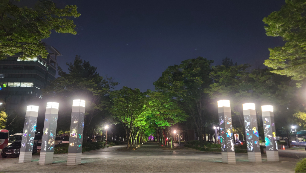 대전 서구 둔산동(보라매공원)에는 4계절 푸르른 소나무와 스트로브잣나무 외에도 가로수길 양옆으로 샛노란 해바라기 화분과 예술 조형물이 설치돼 있어 밤이면 가로수길을 멋진 야경장소로 탈바꿈시킨다.