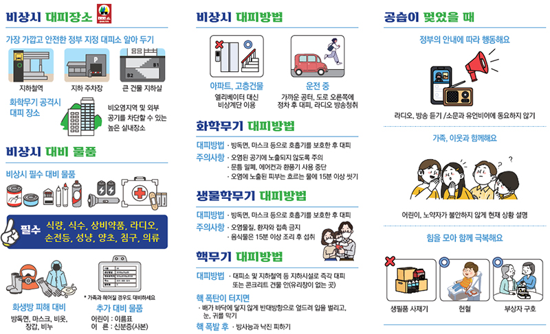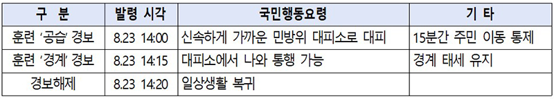 한편 주민대피 훈련은 23일 오후 2시 정각에 훈련 공습경보가 발령되면 즉시 가까운 민방위 대피소로 대피해야 하며, 인근에 대피소가 없는 경우 안전한 지하공간으로 대피해야 한다.
