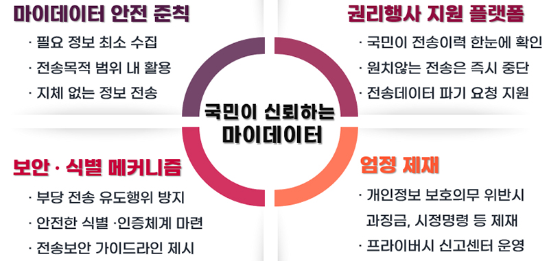 이 과정에서 국민이 신뢰할 수 있는 마이데이터 프라이버시 보호체계를 확립하고 개인정보 보호 메커니즘을 마련하며, 특히 개인정보 보호의무 위반시에는 엄정하게 제재할 방침이다.