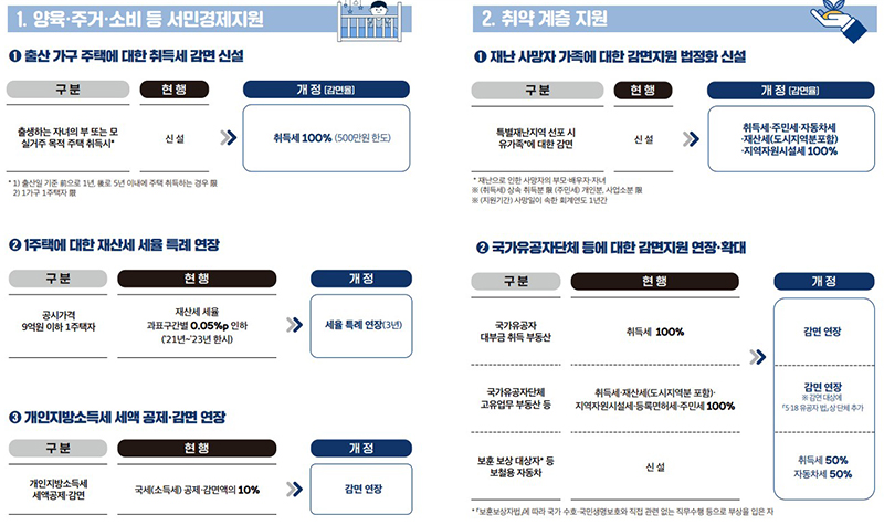 아울러 국가유공자 및 국가유공자단체에 대한 감면지원을 연장하고, 보훈보상 대상자 등의 이동권 보장을 위해 보훈 보상 대상자 등의 자동차에 대한 취득세 50%와 자동차세 50% 감면을 신설한다.