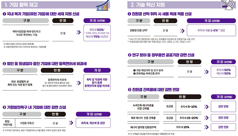 경제 공급망 안정 및 지역경제 활성화를 위해 해외에서 국내로 복귀하는 유턴 기업에는 취득세 50%와 재산세 75% 감면을 신설한다.