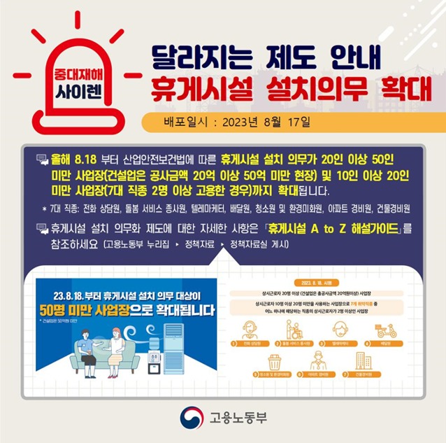 고용노동부와 한국산업안전공단는 8.18.(금)부터 시행되는 50인 미만 사업장(20인 이상)에 대한 휴게시설 설치 의무화 제도 확대와 관련하여 전국 48개 지방관서별로 캠페인을 실시한다고 밝혔다. 캠페인은 50인 미만 소규모 사업장이 밀집된 산업단지, 지식산업센터 및 유동 인구가 많은 장소 등을 중심으로 출퇴근 시간대에 진행된다.