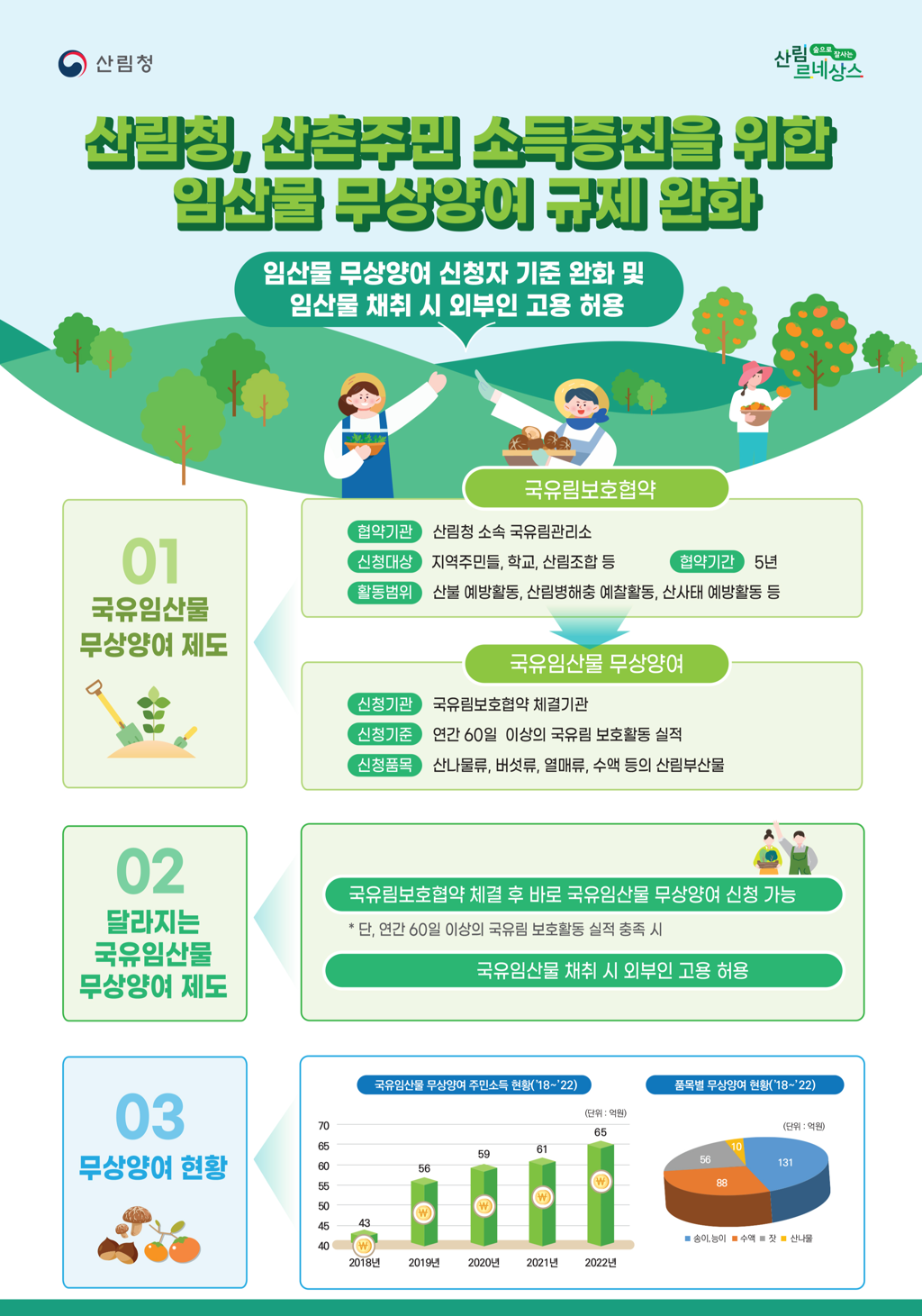 산촌 주민들의 양여제도 개선의견을 수렴하여 ① 국유림보호협약을 체결 후 1년이 지나야 임산물 무상양여 신청이 가능했던 규정을 없애고, ② 임산물 채취 시 외부인을 직접 고용할 수 있도록 제도를 개선하였다.