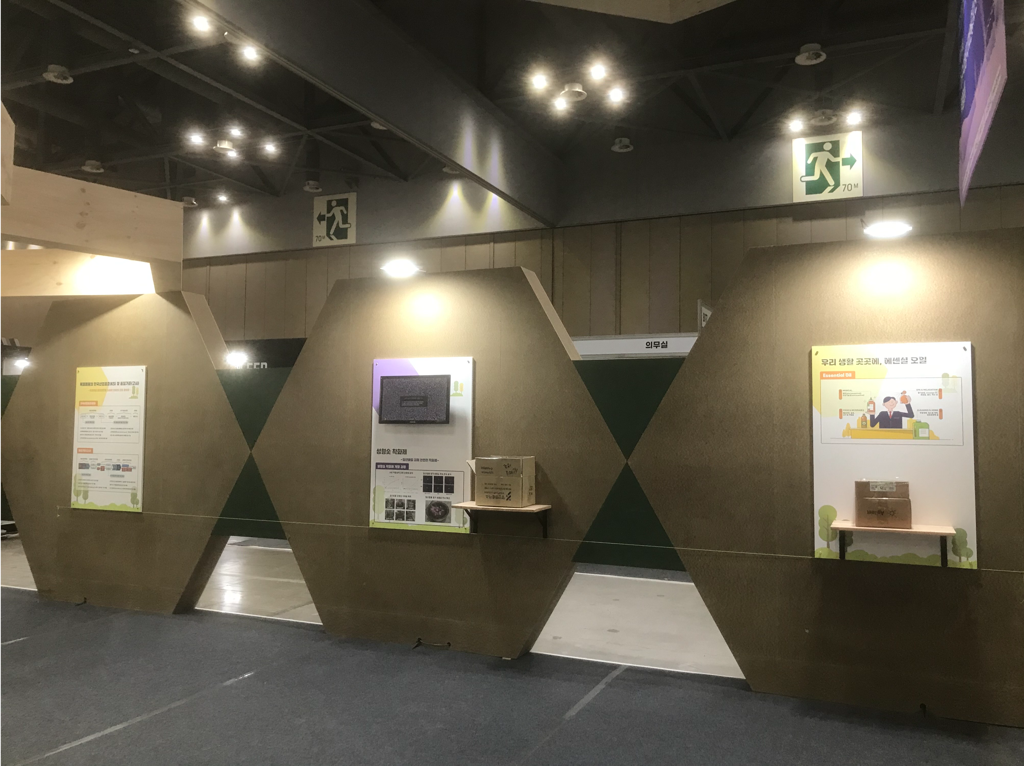 특히, 이번 설명회가 진행되는 공간의 구조물을 국산 잣나무 합판과 국립산림과학원에서 개발한 구조용파티클보드(SPB, structural particle board)를 사용하였다.