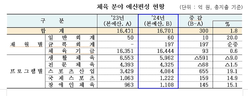 2024년 체육 예산 1조 6700억 원 편성…패럴림픽 예산 신규 편성