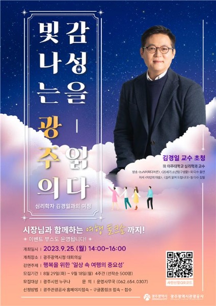 광주광역시(시장 강기정)와 광주관광공사는 오는 25일 오후 2시 시청 대회의실에서 시민을 대상으로 ‘스타강사 김경일 교수 초청 여행특강’을 개최한다.