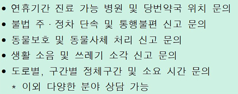 또한 불법 주·정차 단속 및 통행불편 신고 문의, 행정기관 업무 관련 일반 상담, 전기·수도 고장, 학교폭력 등 각종 비긴급 신고상담도 가능하다.