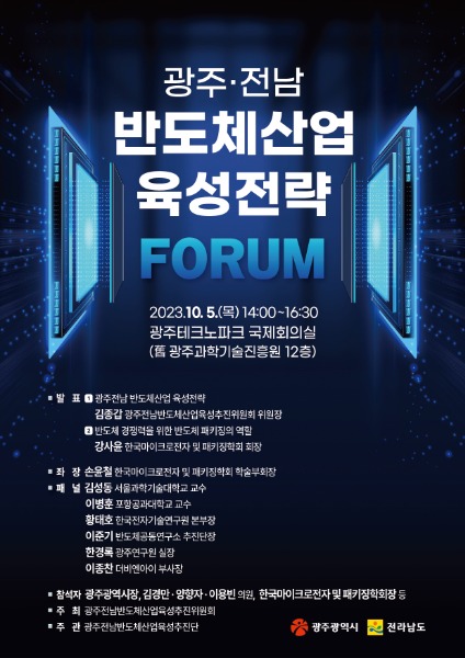 광주광역시(시장 강기정)는 오는 10월5일 오후 2시 광주테크노파크 국제회의실에서 ‘광주·전남 반도체산업 육성전략 포럼’을 개최한다.