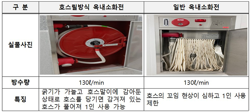 이를 통해 호스말이에 감겨있는 수관을 끌어당기면 손쉽게 1인 사용이 가능해 신속한 화재진압이 가능한 호스릴방식의 옥내소화전을 설치하도록 했다.