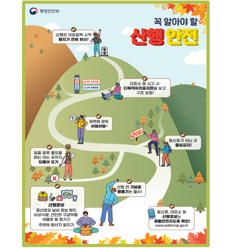 행정안전부는 가을철 등산, 낚시 등 야외활동이 증가함에 따라 산행 시 발생하기 쉬운 등산 사고와 낚시할 때 지켜야 할 안전 요령에 대해 안내하고 안전사고 예방에 주의를 당부했다.