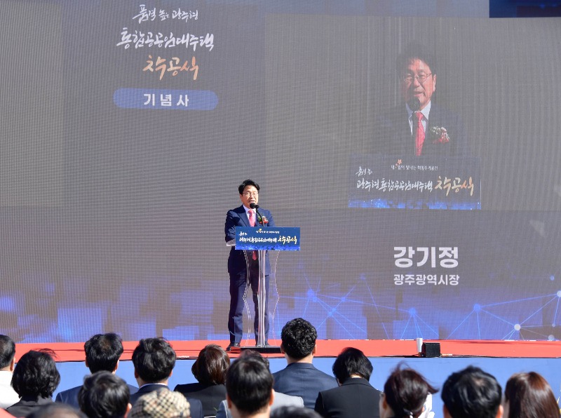 광주광역시(시장 강기정)와 광주도시공사(사장 정민곤)는 20일 상무지구 치평동 1166번지(옛 상무소각장 동쪽 부지)에서 강기정 시장과 정민곤 광주도시공사장, 심철의 광주시의회 부의장과 임미란·명진·김나윤·강수훈·안평환·박수기·김용임·조석호 시의원, 서구의회 의원, 정기섭 대한주택건설협회 광주전남도회장, 정인채 대한건축사협회 광주건축사회장, 시민 등이 참석한 가운데 ‘광주형 통합공공임대주택 건립사업 착공식’을 개최했다.