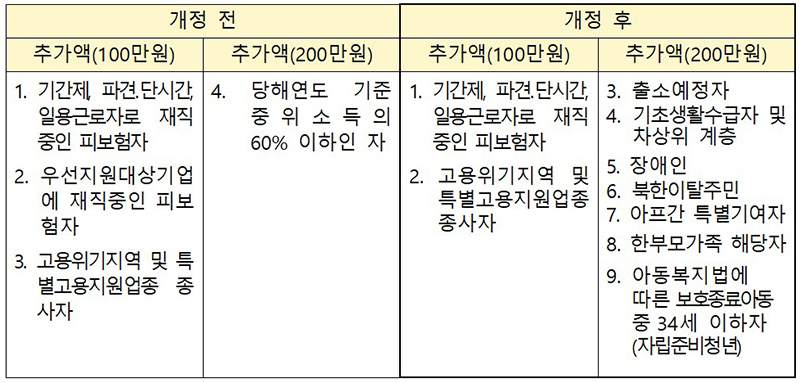 또한 장애인, 한부모가족 해당자, 자립준비청년, 북한이탈주민, 아프간 특별기여자, 출소예정자 등 취약계층은 국민내일배움카드 계좌한도 300만 원을 모두 소진했을 경우 200만 원을 추가로 지원한다.