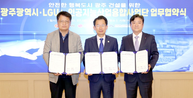 광주광역시(시장 강기정)는 27일 시청 비즈니스룸에서 인공지능을 활용한 CCTV관제센터 관제기술 고도화를 위한 회선사업자인 엘지유플러스(LGU+), 인공지능데이터센터를 운영하는 인공지능산업융합사업단과 ‘안전도시 광주건설 업무협약’을 체결했다.