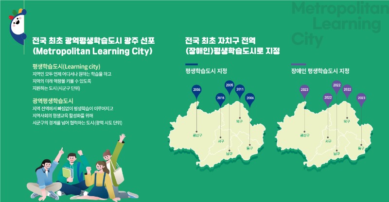 광주시는 전국 최초로 5개구 모두 평생학습도시와 장애인평생학습도시로 선정돼 지난 6월 광역평생학습도시를 선포했다.