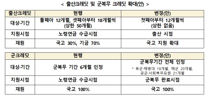 이 밖에도 출산 및 군복무에 대한 크레딧을 확대하는 등 인구 구조 변화에 맞춰 형평성을 강화하는 방안도 담겼다.