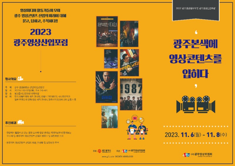 둘째 날에는 ‘2023 광주영상산업포럼’이 7일 오후 2시 빛고을시민문화관 다목적실에서 열린다. 이날 포럼은 고용한 호남대학교 미디어영상공연과 교수의 ‘대한민국 영상산업의 흐름과 방향성’이라는 주제발표에 이어 현장에서 활동하고 있는 전문가들이 모여 종합토론을 벌인다. 이 자리에서는 광주 영상산업의 현주소를 되짚어 보고, 산업적 측면에서의 비즈니스모델 구축과 향후 발전방향을 함께 모색한다.