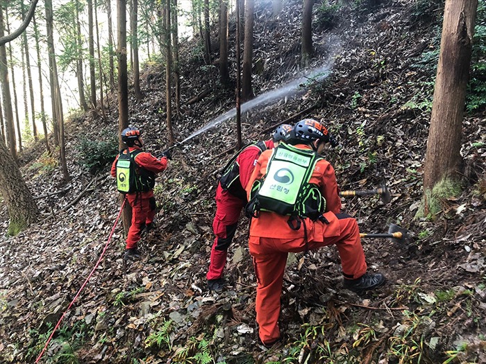 훈련 내용은 계곡부 중형펌프를 설치 및 가동하여 진화용 호스와 살수건을 이용해 직접 진화하는 방식의 훈련을 실시했다.
