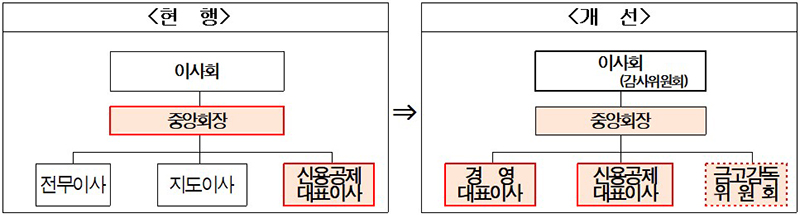 중앙회장에게 집중된 권한을 분산하고 대표이사 체제로 개편해 견제와 균형의 지배구조와 책임경영을 확립하기로 했다.