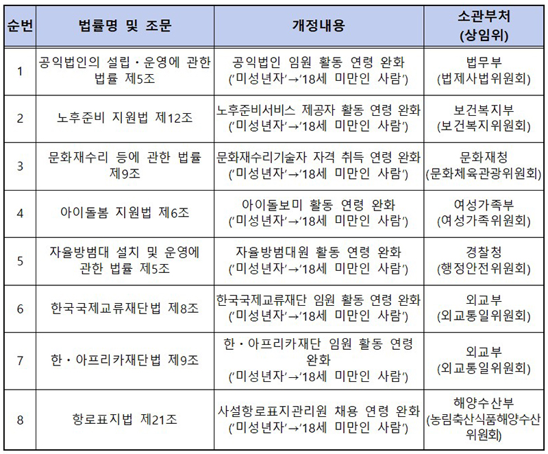 자율방범대원 활동, 공익법인 임원 활동, 한국국제교류재단 임원 활동 및 한·아프리카재단 임원 활동을 위한 법령상 연령제한도 ‘미성년자’에서 ‘18세 미만인 사람’으로 완화한다.