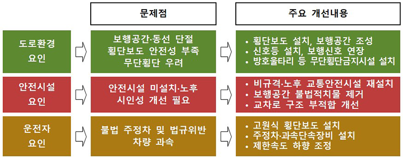 이에 횡단보도 신설, 보행신호 시간 연장을 위한 신호체계 개선, 차로 축소를 통한 보행공간 확충, 방호울타리 등 무단횡단 방지시설 설치 등을 통해 개선해 나갈 예정이다.