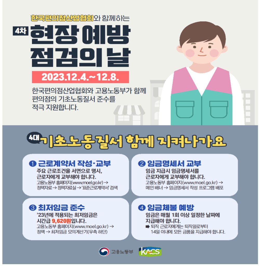 고용노동부는 겨울방학 등을 앞두고 청년 등 취약계층이 주로 종사하는 편의점을 대상으로 12월 4일부터 1주간 기초노동질서 준수 분위기 확산을 위한「현장 예방점검의 날」을 운영한다고 밝혔다.