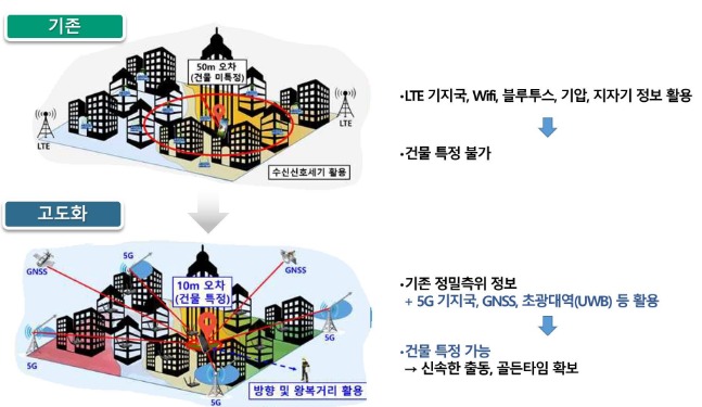 현재 측위 기술은 넓은 범위(50m 오차) 건물 수색이 필요하기 때문에 최신 5세대 이동통신(5G) 기술과 다양한 위성항법시스템(GNSS) 등을 활용한다. 신고자 위치를 건물 단위까지 특정(오차 10m 이내)할 수 있도록 정밀 측위 기술을 고도화할 방침이다.