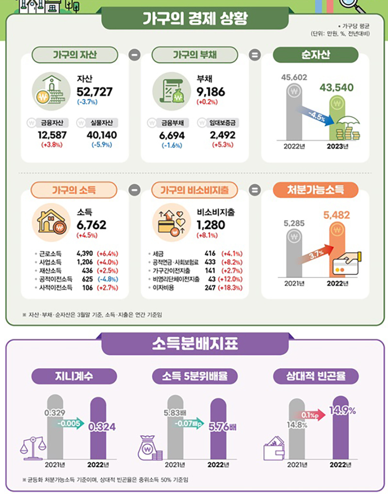 이에 따라 가구당 순자산(자산-부채)은 4억 3540만 원으로 지난해 4억 5602만 원보다 4.5%(2062만 원) 감소해 가구당 순자산이 마이너스 증가율을 기록한 것은 지난 2013년(-0.2%) 이후 10년 만이다.