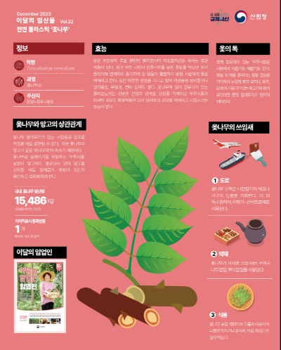 12월 이달의 임산물 주인공은 ‘옻나무’다. 옻을 옻나무 열매로 잘못 알고 있는 경우도 있는데, 옻나무 표피에 칼로 상처를 내 나오는 수액이 옻이다. 옻나무 수액은 처음 나올 때는 회색이지만 말리면 검붉은색으로 변한다. 옻은 예로부터 나전칠기를 제조할 때나 가구의 도료로 이용됐다. 이 외에 특수접착제, 비행기ㆍ선박 도료로도 쓰인다.