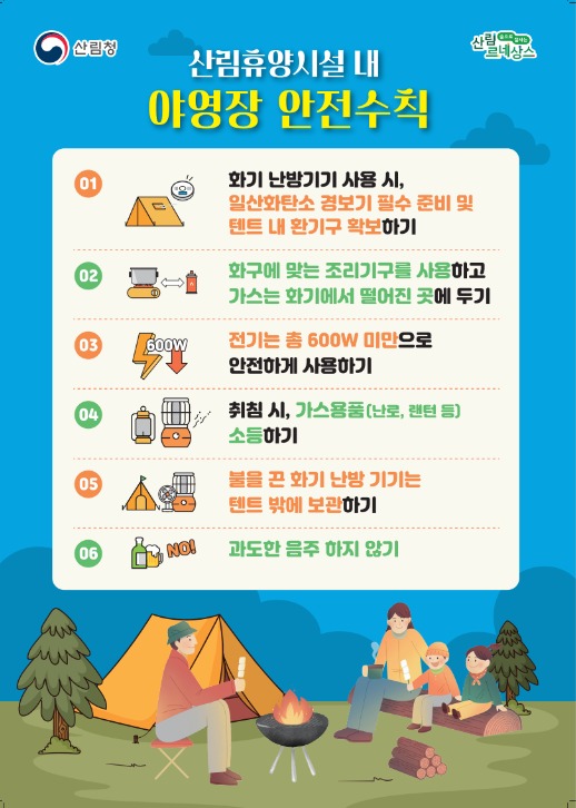 남성현 산림청장은“산림휴양시설 내 야영수칙 준수를 통해 모두가 안전하고 즐거운 야영이 되었으면 한다”라며, 특히“겨울철 추운 날씨에 텐트 내 화기 난방기기 사용이 증가하여 일산화탄소 중독 사고가 늘어나고 있다며 각별한 주의가 필요하다”라고 덧붙였다.