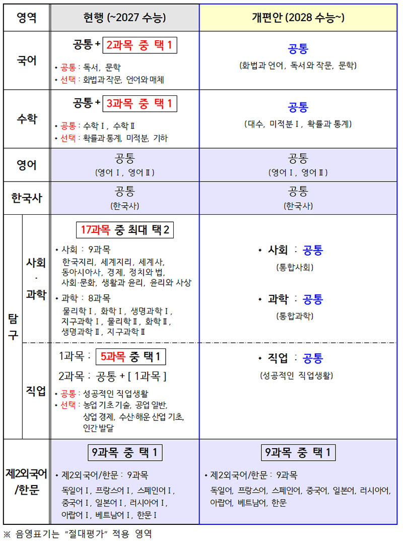 2028학년도 대학수학능력시험(이하 수능)부터 모든 수험생의 경우 국어, 수학, 사회, 과학은 선택과목 없이 통합형으로 시험을 봐야 한다. 내신은 기존 9등급에서 5등급 체제로 바뀐다.